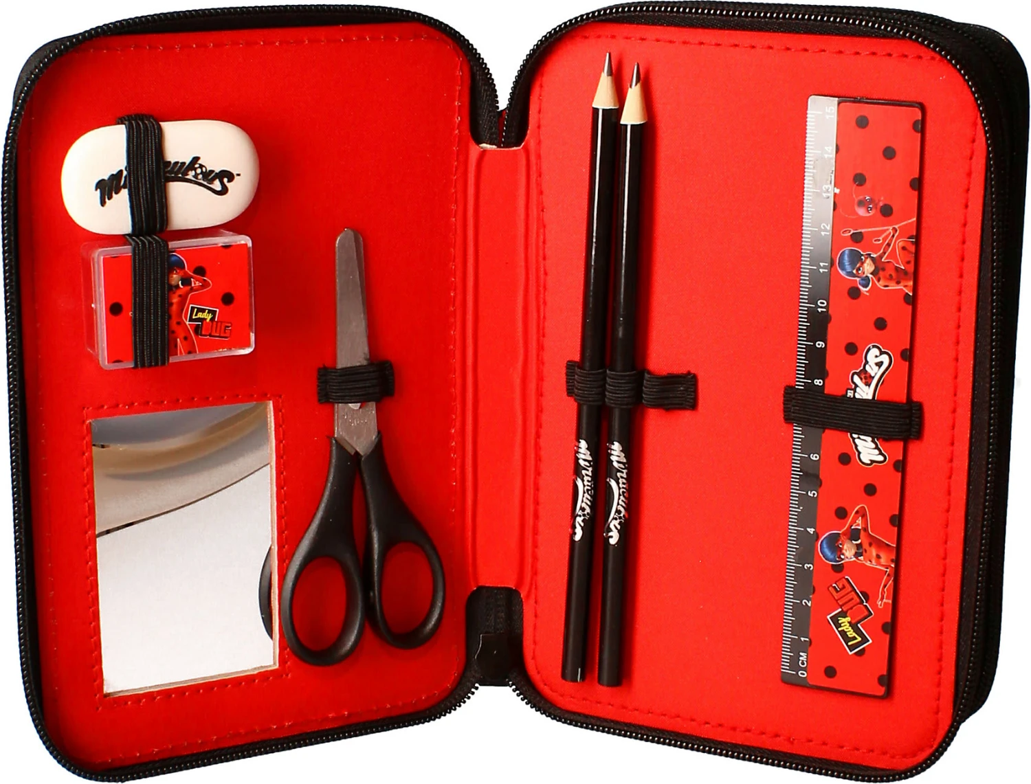Miraculous – Schüleretui – Kinder Federmappe Lady Bug – Große Federtasche für die Schule Ausstattung: Federmappe ist unterteilt in drei separat abgeteilte Fächer mit Reißverschluss. Inhalt: – 18 Buntstifte – 18 Fasermaler / Filzstifte – 2 Bleistifte – 1 Radiergummi – 1 Stifte Anspitzer – 1 Lineal – Anzeige bis 15,0 cm – 1 Schere – 1 integrierter Spiegel Abmessungen: Länge 20,0 cm x Breite 13,0 cm x Höhe 7,0 cm Warnhinweise des Herstellers: Achtung! Nicht geeignet für Kinder unter 36 Monaten! Artikel enthält (besteht aus) Kleinteilen, die verschluckt werden könnten. Erstickungsgefahr!