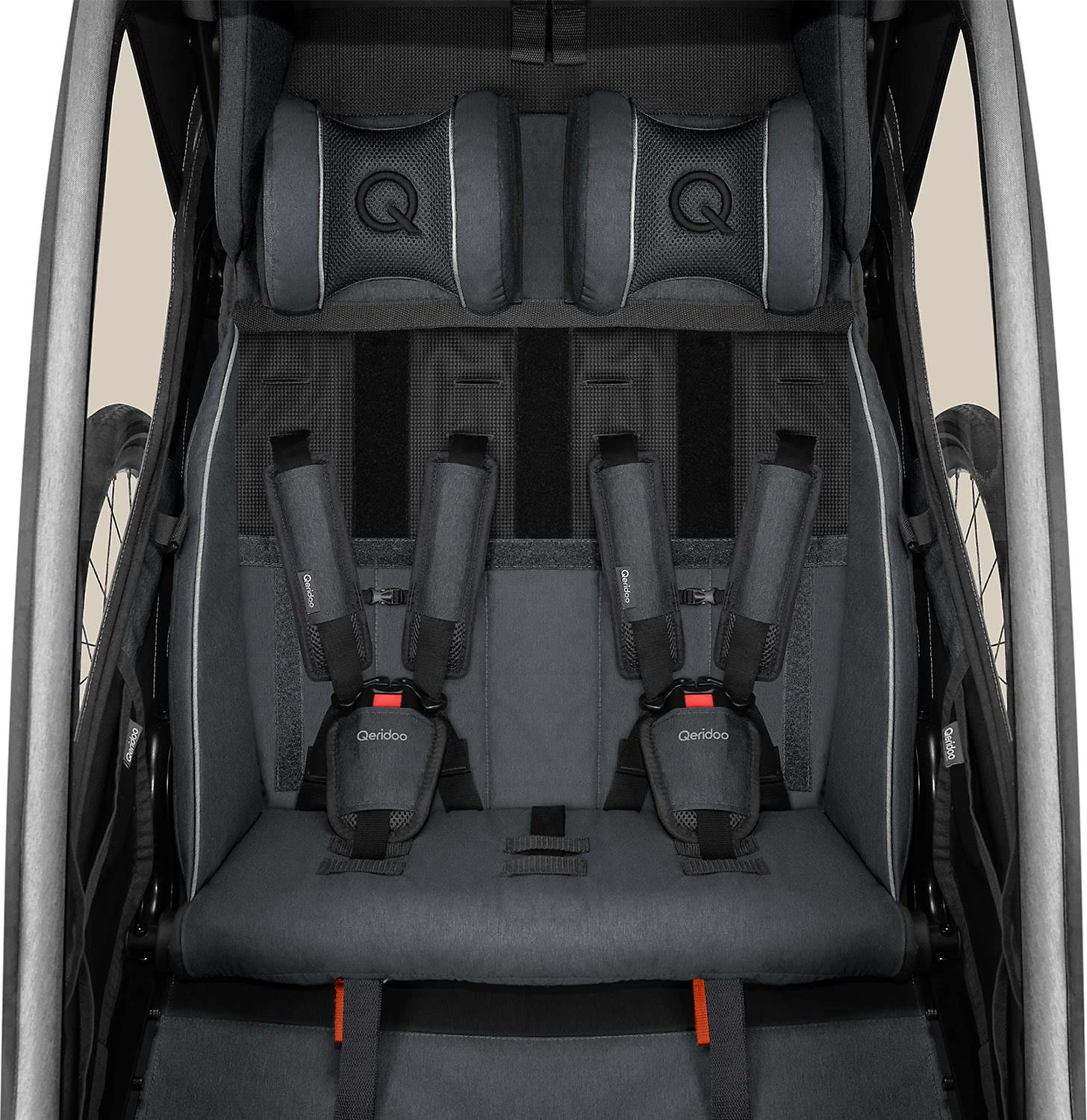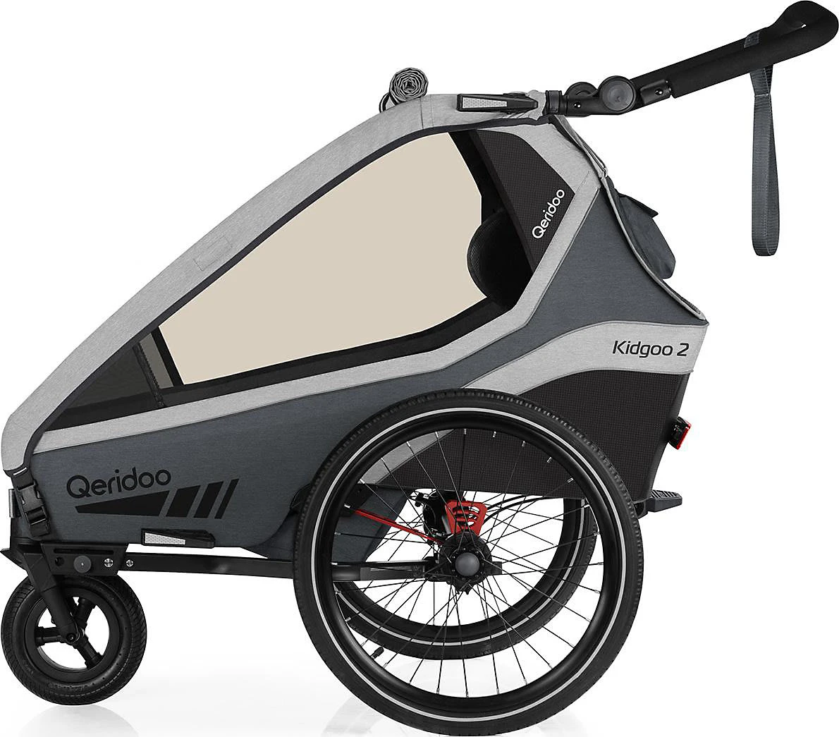 Mit dem Fahrradanhänger Kidgoo 2 von Qeridoo kannst Du zwei Kinder transportieren und flexibel zwischen dem Trailer- und dem Buggy-Modus wechseln. Ergänzt Du separat erhältliches Zubehör ist auch eine Nutzung als Jogger-, Skater-, Ski- und Hike-Modell möglich. Außerdem eignet sich der Anhänger mit separat erhältlichen Hängematten oder Babyschalen bereits für den Transport der Kleinsten. Altersempfehlung: ab 6 Monaten, ab 1 Monat mit Babyschale oder Hängematte (separat erhältlich) im Buggy-Modus bzw. ab 3 Monaten im Trailer Belastbarkeit: insgesamt bis 60 kg Verwendung: Fahrradanhänger, Buggy, mit separat erhältlichem Zubehör als Jogger, Skater, für den Babytransport, Ski- und Hike-Ausflüge Klappmaß: 108(L) x 76(B) x 47(H) cm Gewicht: 18,5 kg Räder: luftgefüllte Laufräder (20 Zoll), luftgefülltes Buggyrad mit Schwenkfunktion (8 Zoll) Lieferumfang: Kabine mit 2 Sitzen, 2 Kopfstützen und 2 Gurtsystemen, Transportsicherung, Achse, Schiebegriff mit Handschlaufe, 2 Laufräder, Buggyrad, 2 Radabweiser, 2 Kopfprotektoren, Deichsel, Kupplung mit Reduzierstück M5, Wimpel, LED-Rücklicht, Innensechskantschlüssel, Benutzerhandbuch, Achs-Finder Gestell: verstärkter Aluminiumrahmen mit Bodenschutz, tiefer Schwerpunkt, Seiten- und Heckaufprallschutz, Blattfeder-Dämpf-System, Slide-On-Radabweiser mit Reflektorstreifen, Handbremse, höhenverstellbarer Schiebegriff, Deichsel mit Kupplung und Schnellwechselfunktion, kompakt zusammenfaltbar Kabine: 3-in-1-Verdeck (Insekten-, Sonnen- und Spritzwasserschutz) mit integriertem Verstaufach, Slide-On-Kopfprotektoren mit Reflektorstreifen, Komfort-Sitzsystem, gepolsterte 5-Punkt-Sicherheitsgurte (easy-ARS), höhenverstellbare Kopfstützen, Netztasche, Vorrichtung für Babyschale/Hängematte, XL-Kofferraum mit Magnetverschlüssen, Heckklappe mit Zickzack-Gummischnürung und kleiner Tasche, zusammenfaltbar Sicherheit und Komfort Mit dem Fahrradanhänger Kidgoo 2 kannst Du zwei Kinder ab sechs Monaten transportieren. Die Minis können es sich auf den Komfort-Sitzen gemütlich machen. Sowohl die Kopfstützen als auch die 5-Punkt-Gurte können auf ihre Proportionen abgestimmt werden. Sie sorgen ebenso wie die Slide-On-Kopfprotektoren, der Überrollbügel und der Seiten- und Heckaufprallschutz für Sicherheit im Straßenverkehr. Für eine gute Sichtbarkeit setzt der Anhänger auf reflektierende Details. Um jederzeit optimalen Wetterschutz zu bieten, ist der Kidgoo 2 mit einem 3-in-1-Verdeck ausgestattet. Es dient als Sonnen-, Spritzwasser- und Insektenschutz. Für eine unkomplizierte Unterbringung ist ein praktisches Verstaufach inklusive. Dein Gepäck, Baby-Utensilien oder Spielzeug kannst Du in dem großen XL-Kofferraum unterbringen. Er ist mit bis zu fünf Kilogramm belastbar und verfügt über einen geräuschlos bedienbaren Magnetverschluss. An der Heckklappe stehen Dir zusätzlich eine Zickzack-Gummischnürung und eine Tasche für Kleinigkeiten zur Verfügung. Gestell und Fahrwerk Der Trailer setzt auf einen verstärkten Aluminiumrahmen mit einem Bodenschutz und einem tiefen Schwerpunkt. Die luftgefüllten Reifen werden von einem Blattfeder-Dämpf-System ergänzt. So sind eine gute Straßenlage und ein ruhiger Lauf garantiert. Slide-On-Radabweiser bieten einen zusätzlichen Schutz, falls Du Hindernisse nicht weit genug umrundest. Die Deichsel ist mit einer Schnellwechsel-Funktion ausgerüstet. So kannst Du im Nu vom Trailer- in den Buggy-Modus wechseln. Der Überrollbügel dient Dir dann als höhenverstellbarer Schieber mit Handschlaufe. Lieferumfang Zum Lieferumfang des Fahrradanhängers gehören das Gestell, die Kabine und die Deichsel samt Kupplung und Reduzierstück. Auch ein Wimpel, ein LED-Rücklicht, ein Innensechskantschlüssel, ein Benutzerhandbuch und ein Achs-Finder sind inklusive. Besonderheiten Kombinierst Du den Anhänger mit einer separat erhältlichen Babyschale oder Hängematte, kann Dein Nachwuchs ab einem Monat im Buggy-Modus reisen. Im Fahrradanhänger