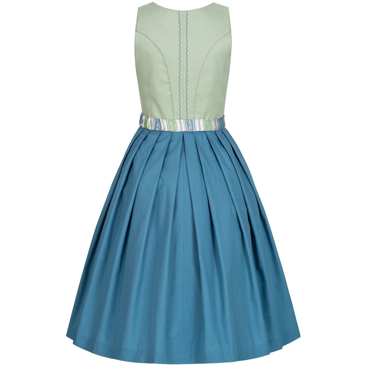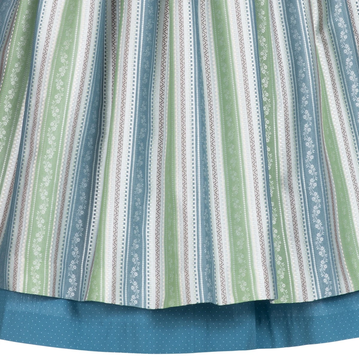 Ein Midi Dirndl Pillersee in Grün von der Marke Hammerschmid. Sehr schön zeigt sich das Modell Pillersee mit einem traditionellen Mieder, welches mit schlichten Knöpfen zu schließen ist. Der Balkonett Ausschnitt sorgt für ein hinreißendes Dekolleté und ist mit einer dezenten Paspel abgesetzt. Der blaue Trachtenrock mit feinem Punkmuster ist schlicht gestaltet. Die wunderschön gestreifte Dirndlschürze verleiht dem Dirndl einen edlen Look. Mit einer Brosche, lässt sich die Schürze auf der Vorderseite schließen. Dieses Dirndl hat eine Rocklänge von 70 cm.