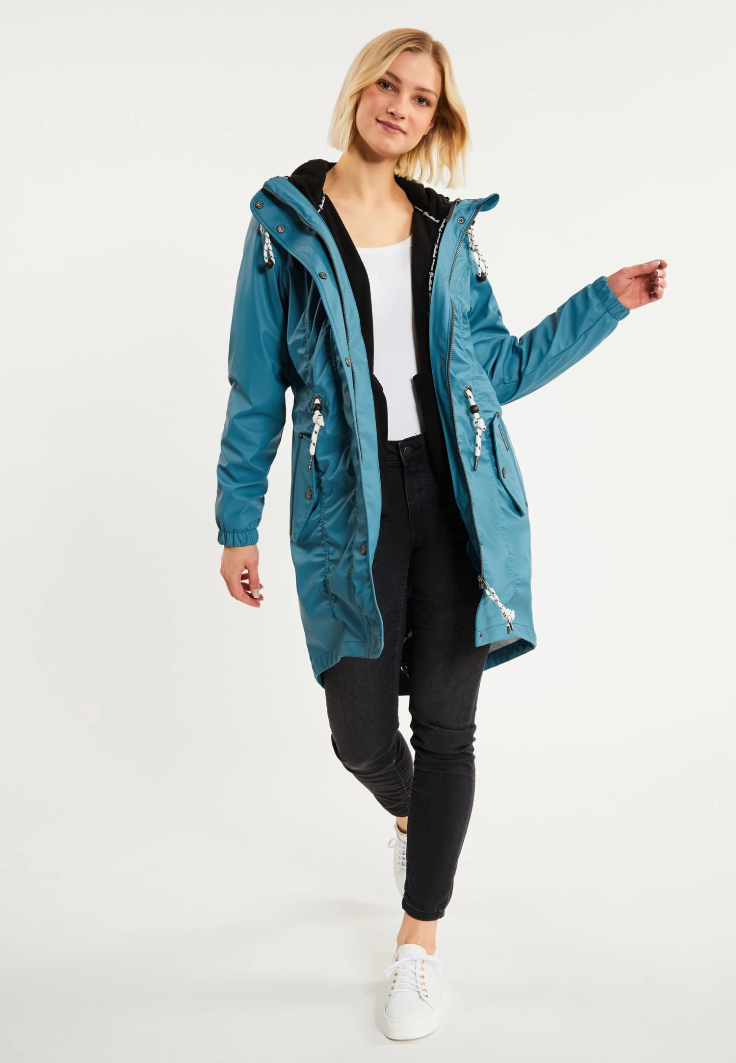 Für jedes Wetter gerüstet sein, ist mit diesem 3 in 1 Regenmantel von Schmuddelwedda kein Problem. Die knielange Außenjacke bietet mit der eingesetzten, kürzeren Innenjacke vielseitige Tragevarianten. So empfiehlt es sich bei Regen und Kälte den Regenmantel plus Fleece-Innenjacke zu tragen. Dank einer Beschichtung und verklebten Nähten ist die Jacke wind- und wasserabweisend. Der Reißverschluss wird mit einer Druckknopfleiste verdeckt und endet in einem hoch schließenden Kragen, der in die Kapuze mit dekorativem Tunnelzug übergeht. Sollte es nicht regnen und Sie brauchen nur schnell eine Jacke zum Überziehen, dann können Sie die Fleece-Innenjacke auch solo tragen. Dies macht ein Reißverschluss im Nu möglich. Für den Regenschauer an warmen Tagen wird der Regenmantel am besten ohne Innenjacke getragen. Der charakteristische Logo-Regenschirm-Print auf der Brust und die vielen, detailverliebten Accessoires komplettieren den Schmuddelwedda-Look.